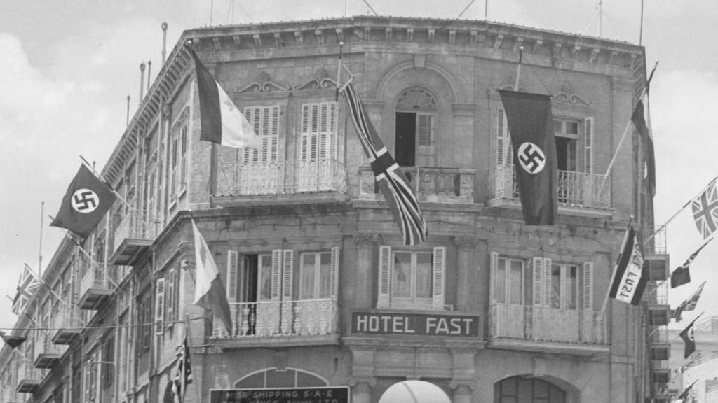 Nazi and British flags together on a hotel in Jerusalem, 1933